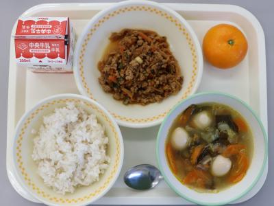 今日の給食は、ねぎみそ丼、牛乳、うずら卵の中華スープ煮、みかんです。うずら卵の中華スープ煮は、たっぷりの野菜とうずら卵、はるさめ使っています。ねぎみそ丼の葉ねぎは、体を温め、体の調子をよくする食材です。ねぎみそ丼は、具をごはんにかけて食べましょう。どの料理もよくかんで食べましょう。