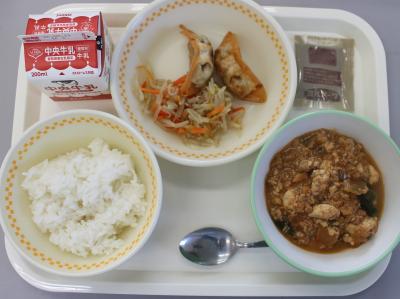 今日の給食は、ごはん、牛乳、ひじき入り揚げぎょうざ、もやしいため、マーボー豆腐、ココア糖です。マーボー豆腐は給食で人気メニューの一つです。給食のマーボー豆腐は、たまねぎがたっぷり入り、みそのほかに、ケチャップやしょうゆが入っています。豆腐には骨や歯を強くするカルシウムがたっぷり含まれています。