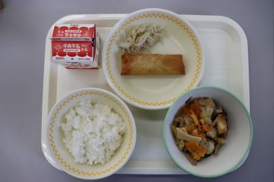 今日の給食は、ごはん、牛乳、青じそ春巻、もやしいため、中華いため煮です。今日の春巻には、豊橋産の青じそが入っています。しそは大葉ともよばれる青じそと、梅干しの色をつけるのに欠かせない赤しその2種類があります。青じそは、さわやかな風味が特徴で、食欲を増す働きがあり、豊橋は全国でも有数の産地です。また、中華いため煮にうずら卵が入っています。よくかんで食べましょう。