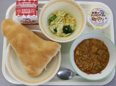 今日の給食は、ナン型ロールパン、牛乳、米粉キーマカレー、やさいサラダ、お米のババロアです。今日の献立はアジアを食べる学校給食の日で、インド料理を実施します。インド料理は多くのスパイスを使い地域ごとに特色がある料理です。インドの料理を食べてアジアの食文化にふれ、2026年アジア・アジアパラ競技大会を応援しましょう。