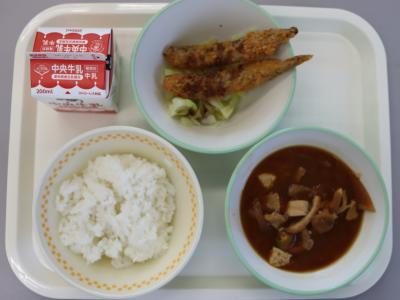 今日の給食は、ごはん、牛乳、子持ちししゃもフライ、ゆでやさい、豚汁です。豚汁に使われている赤みそは、大豆とこうじと塩で作ります。赤みそのなかまの八丁みそは、2年以上熟成させて作るので、色は黒く、大豆のうまみがギュッとつまっていて、独特のおいしさが味わえます。子持ちししゃもフライは、骨ごと食べられるので、骨や歯を強くするカルシウムが多くとれます。よくかんで食べましょう。