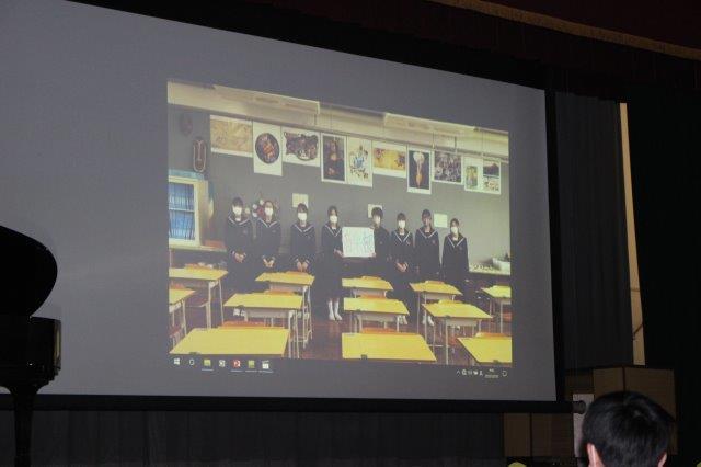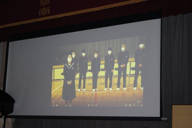 校長先生は,1,2年生が3年生のために,会場準備や清掃活動,動画の撮影などを行っていたことを3年生に伝えました。また,感染症対策で,同じ会場で一緒に過ごすことができなかったけれども,同じ思いでこの会を迎えたことに心があたたかくなったと話をされました。