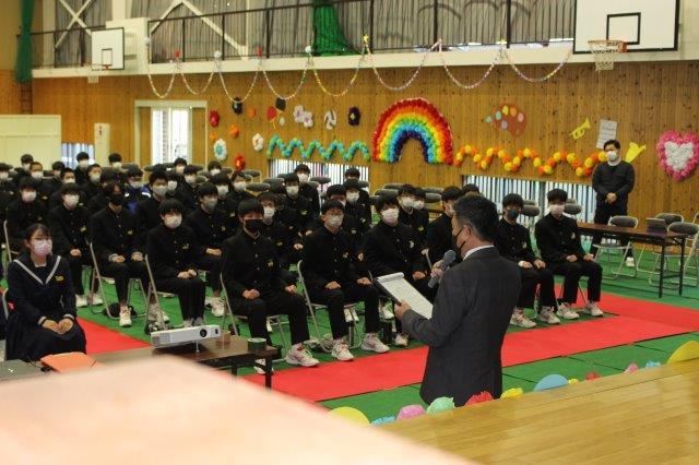 感染症対策のため,体育館には3年生と生徒会執行部が入場し,1,2年生は教室でオンライン参加するという形で行いました。