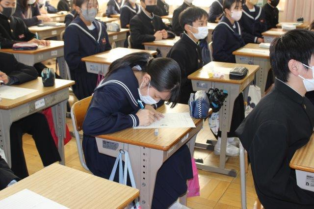 お話の中で,中学生としてがんばってほしいこととして,「興味あることにどんどん挑戦してほしい」,「自分の可能性を広げることなので,勉強もしっかりがんばってほしい。」とのメッセージをいただきました。