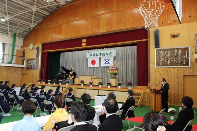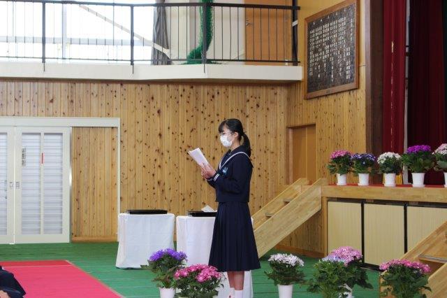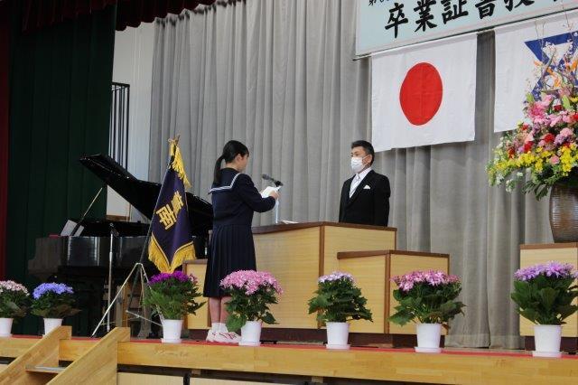 卒業生の代表生徒が,感染症の流行にも負けず,3年間がんばった思い出や,在校生,保護者,地域の方への感謝の気持ちを込めて,答辞を述べました。