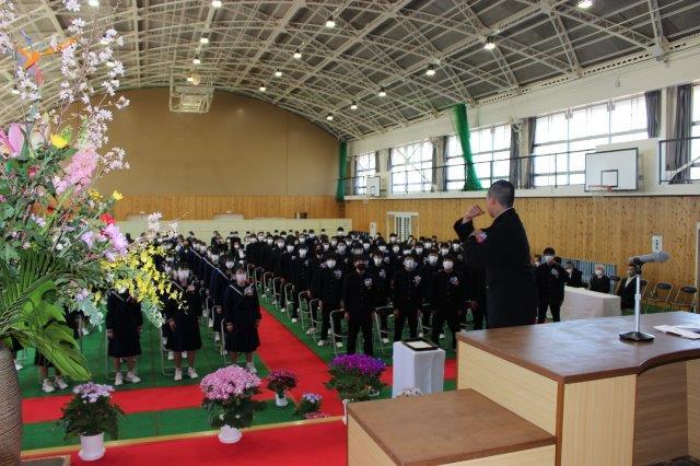 校長が学年目標である「大夢真心(タイムマシン)(大きな夢と真の心)」について3年間を振り返りながら式辞を述べました。