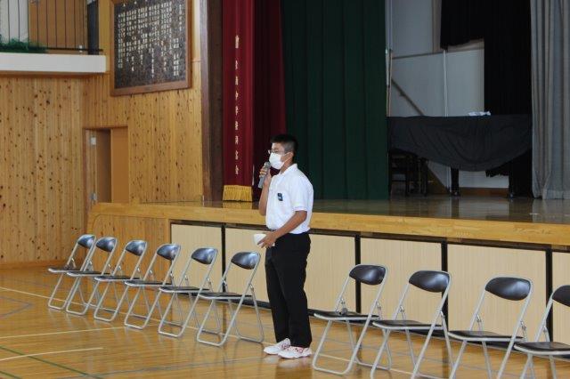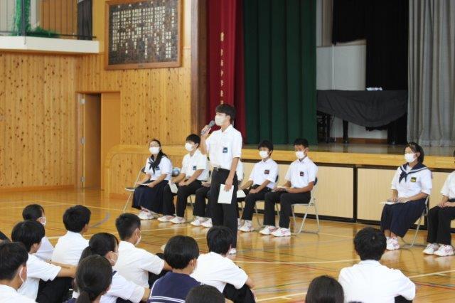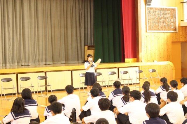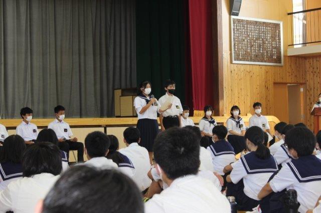 話し合いの結果を,3年生の代表者が全校に伝えました。