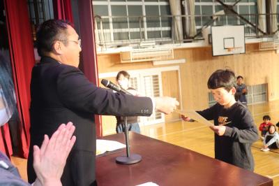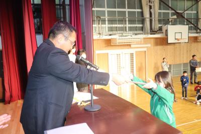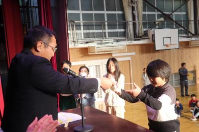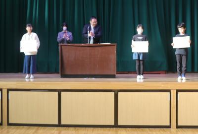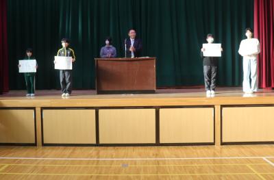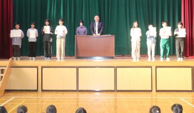 朝礼の中で,2学期に取り組んだ理科スケッチ展や夏休みに取り組んだ作品で優秀な成績を収めた子の表彰を行いました。