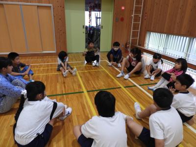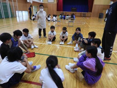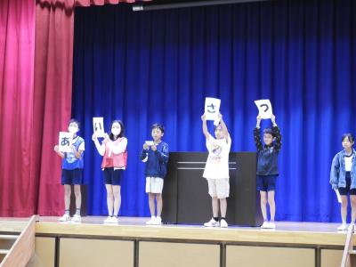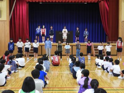 10月14日(火)児童集会が開かれ、計画委員のみなさんが、挨拶名人になるためにと全校児童に呼びかけました。