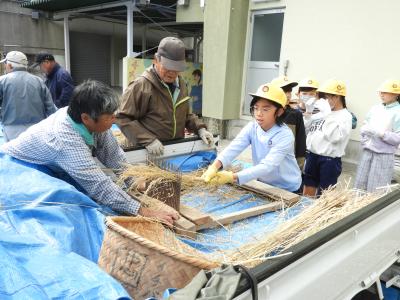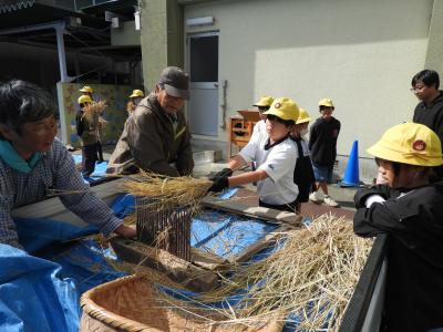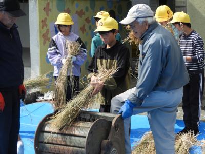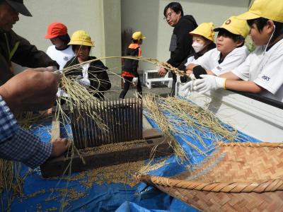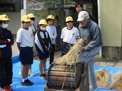 10月24日(金)、5年生が、収穫した米を脱穀する作業を行いました。農業ボランティアの藤原さん、夏目さん、中山さん、鈴木さんにお力添えをいただきました。