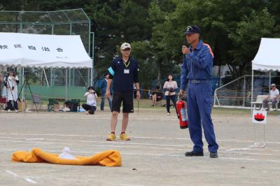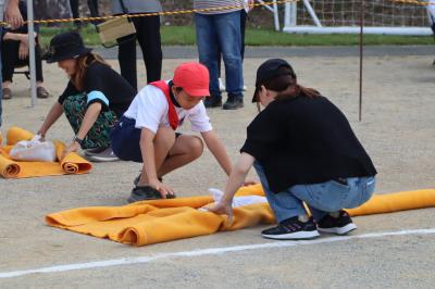 まず、リレーの説明がありました。親子で、水消火器と毛布による担架づくりをします。