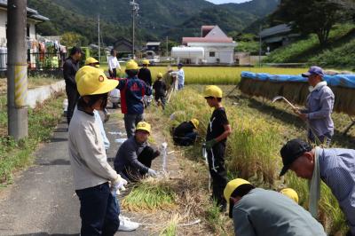 10月2日(木)、5年生が稲刈りをしました。農業ボランティアの藤原さん、夏目さん、中山さん、鈴木さんに教えていただきながらの作業でした。