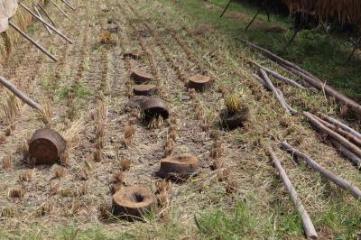 稲の刈り方、束ね方、稲架へのかけ方等を教わりながら、実際に体験しました。