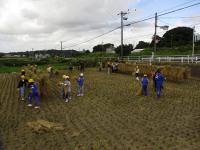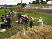 9月30日(火)1から3限に、5年生は稲刈りを行いました。稲穂は黄金色に変わり、たくさんのお米が実っていました。子どもたちは地域のかたの指導のもと、鎌を使って上手に稲を刈ることができました。刈り取った稲は、乾燥させるために束ねて「はざ」にかけました。子どもたちはみんなで協力して全部の稲を刈り取り、楽しく活動することができました。