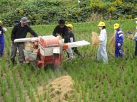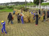 10月24日(金)1、2限に、5年生は借りている田んぼで脱穀を行いました。子どもたちは、「はざ」から乾燥させた稲を取り、地域の方に脱穀機で稲を脱穀していただきました。このあと、脱穀したもみから、もみがらと玄米に分け、精米してもらいます。約120㎏のお米が収穫できるそうです。今まで、地域のかたのご協力により、お米作りの活動ができました。ありがとうございました。