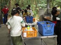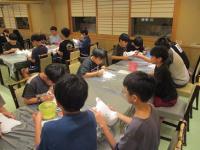 2日目、雨天のため、海岸レクを体育館レクに変更し、長縄やしっぽ取りをしました。昼ごろには雨が上がったため、昼食は外で流しそうめんを行うことができました。子どもたちは、そうめんだけでなく、流れてくるミニトマトやカニカマなども必至に取っていました。