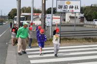 はじめに、道路の歩き方、横断歩道の渡り方、歩行者用信号の見方などを教えていただきました。次に、教えていただいたことを、実際の道路を歩いてやってみました。どの子も、真剣に話を聞き、教えていただいたことを守ろうとしていました。指導員さんに教えていただいた約束「は 走らない ひ 広がらない ふ ふざけない へ 変な人についていかない ほ 歩道を歩く」の「はひふへほ」を守って、交通事故にあわないようにしてほしいと思います。