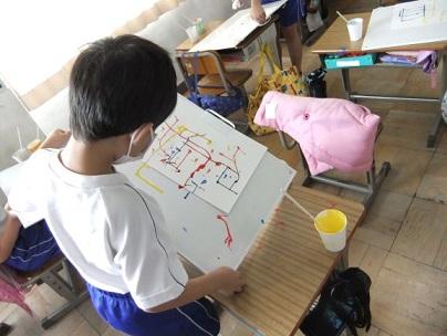 絵の具を置いて,傾けてみると…いろいろな色や線ができあがりました。こちらは,まだこれから作品作りが続きます。