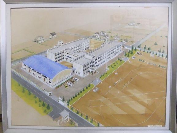 鷹丘小学校ができたときの学校のまわりの様子を描いた絵が渡り廊下に展示されています。家の数が全然違いますね。