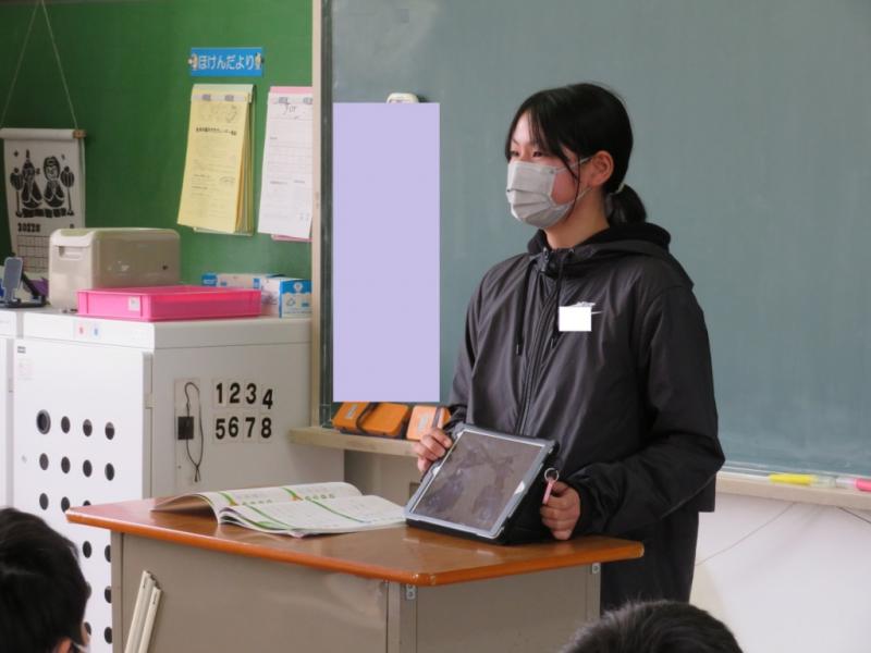 テーマは,中学校で入りたい部活動と将来の夢です。タブレットで画像を提示しながら,みんなにわかりやすく伝えていました。