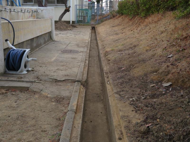 運動場南西の側溝に大量の土がたまっていました。2週間ほど前から少しずつ掃除を進めてきました。