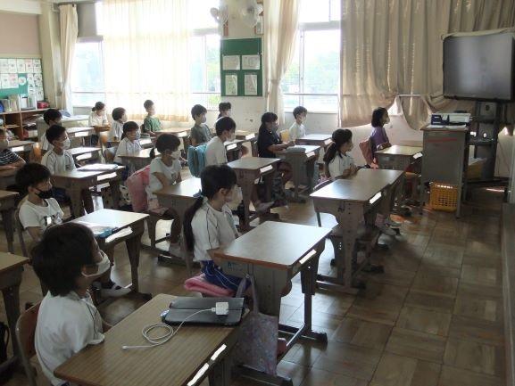 始業式では,1・3・5年の代表児童が2学期にがんばりたいことを発表しました。校長先生から,代表の子だけでなく,一人ひとりががんばりたいことを決めて,笑顔いっぱいの2学期を過ごしてほしいと伝えました。