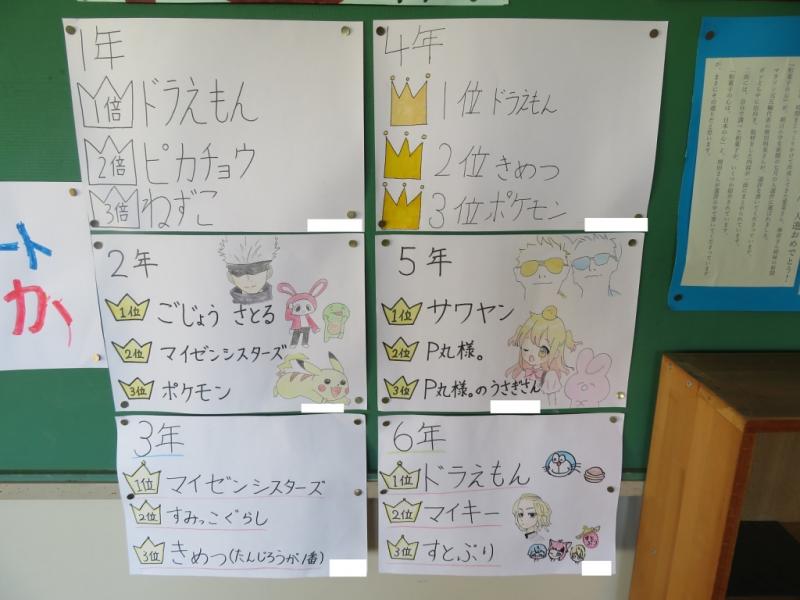 各学年にアンケートをとり,好きなキャラクターを集計したものが掲示してあります。