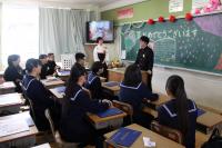 講師には豊橋ハートセンターの杉浦武治さんをお迎えし、心肺蘇生法の講義と実技実習を2時間に渡り行いました。生徒たちは、倒れている人を発見するところから胸骨圧迫やAEDの使用方法など実演しました。生徒たちはこの活動を通して、万が一の緊急時に落ち着いて正しく行動できる基礎的な力を身につけ、命の大切さや人を助ける行動の重要性を理解したことでしょう。