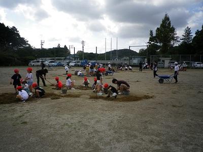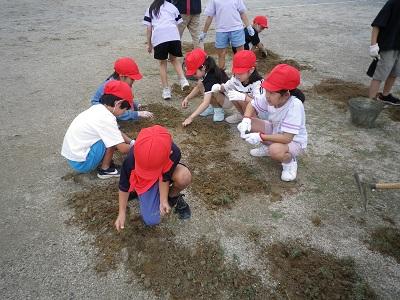 今回は、夏の間に運動場に広がった野芝を減らすために