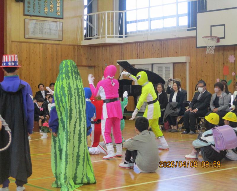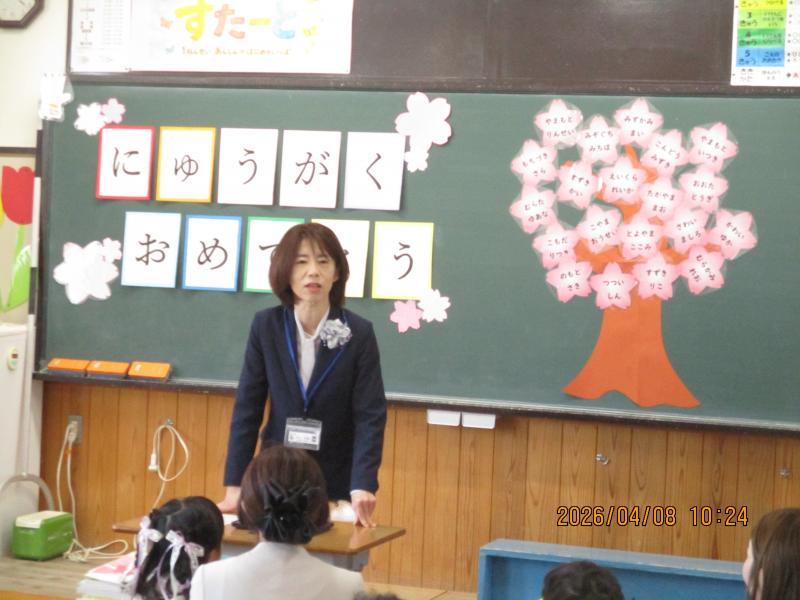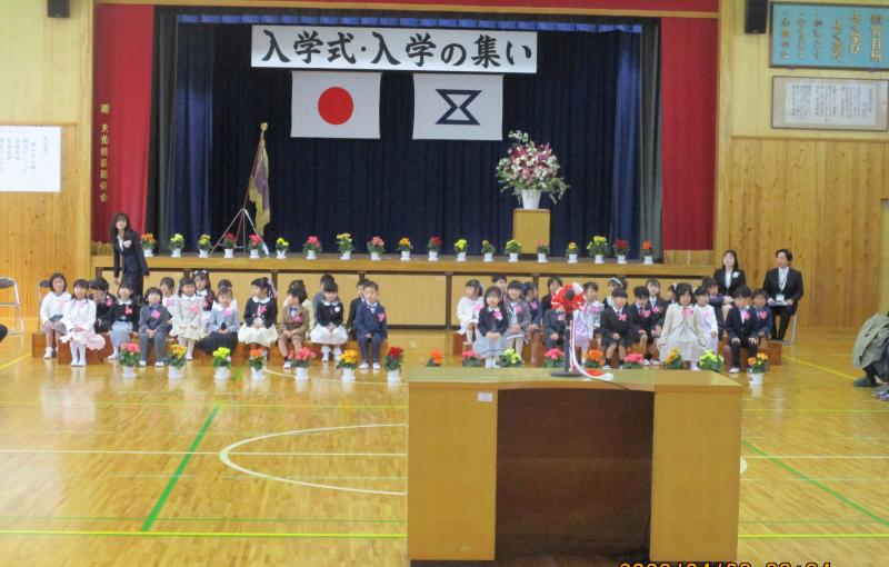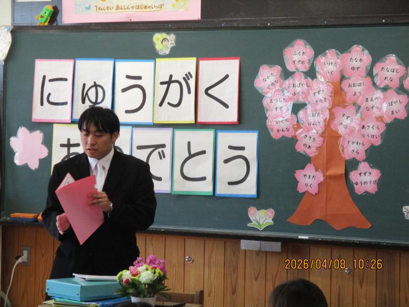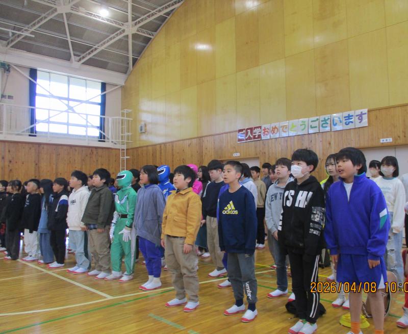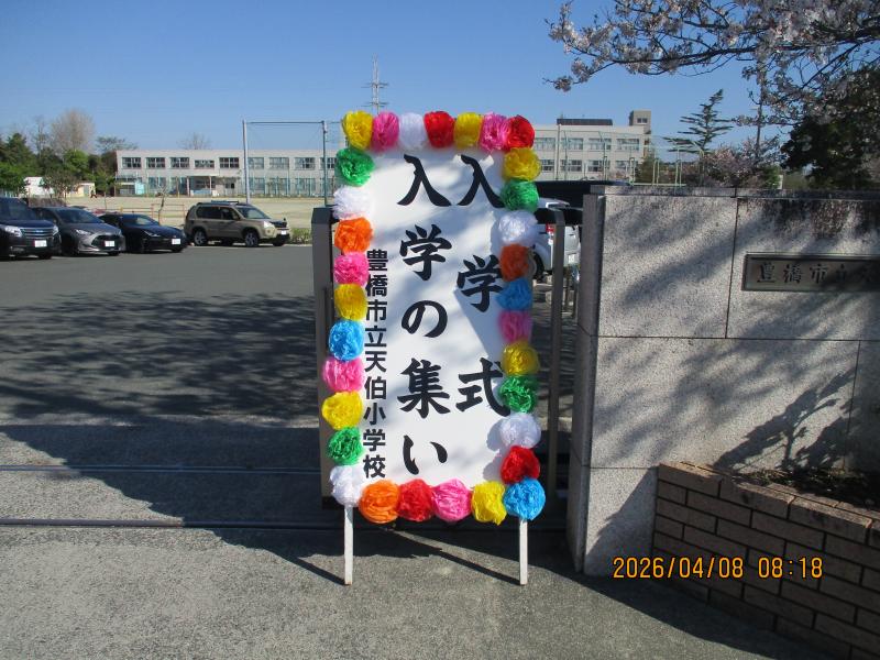 新1年生が天伯小学校に入学しました。校長先生からは、あいさつができること、お話を聞けること、友達と仲よくできることの3つができる子になろうという話がありました。5・6年生からは、天伯レンジャーとともに歓迎のメッセージと歌を贈りました。明日は、全校児童が登校して新任式と始業式を行います。
