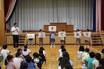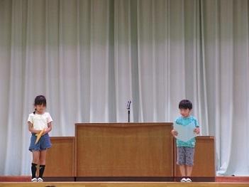 7月19日(金)体育館で1学期終業式を行いました。最初に、1年生の代表児童6名が1学期にがんばったことを発表しました。次に、2年生の代表児童2名が1学期の振り返りと2学期にがんばりたいことを発表しました。どの子も一生懸命考えたすばらしい内容で、落ち着いて発表することができました。