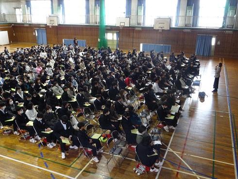 卒業を2日後に控えた3年生に向けて、同窓会入会式とPTA記念品贈呈式を実施しました。。
