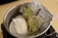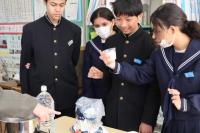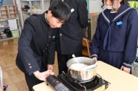 先日、ある学級が「防災クッキング」に取り組んでいました。メニューは「カレーライス」と「焼き鳥とキャベツの蒸し煮」。ガス、電気が使えないこと、水が限られていることを想定し、レトルトパックや缶詰を使い、カセットコンロでの湯煎で調理します。限られた水で調理するため、米は洗わずビニール袋に入れて炊いたり、食後の皿を洗わず再利用できるように紙皿にラップをかけて使ったりしていました。試食した生徒によると味もよかったとのこと。