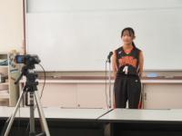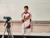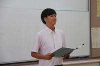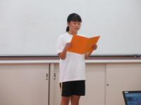 「2学期にがんばりたいことは挑戦するということ」。学習、合唱コンクールや自然体験学習など、みんなで協力して取り組む行事、部活動の3つについて、粘り強く挑戦したい思いを話しました。