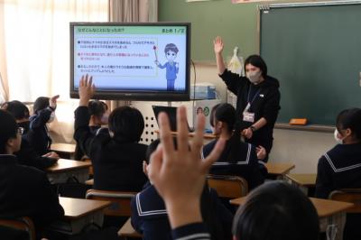 期末テストも終わり、4連休を迎える11月20日(木)、全校一斉に帰りの会で情報モラルについて考えました。今や中学生はSNSを通したトラブルや犯罪と隣り合わせの状況です。一人一人が情報モラルを高める必要があります。今回は、「歩きスマホの事例」や「無断で撮影した動画をネット上にアップしようとした事例」から、どのような判断が必要だったのかを学級で話し合いました。今後も定期的に情報モラルについて考える時間を設定していきます。