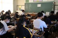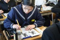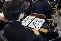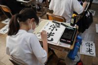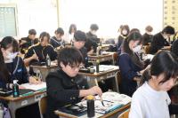 一人一人が一画一画に集中して取り組む教室には軽い緊張感が漂います。ふだんは笑顔と活力があふれる豊岡中学校ですが、ときにはこうした時間もよいものです。習字をとおして静かに自分自身と向き合うことができたのではないでしょうか。