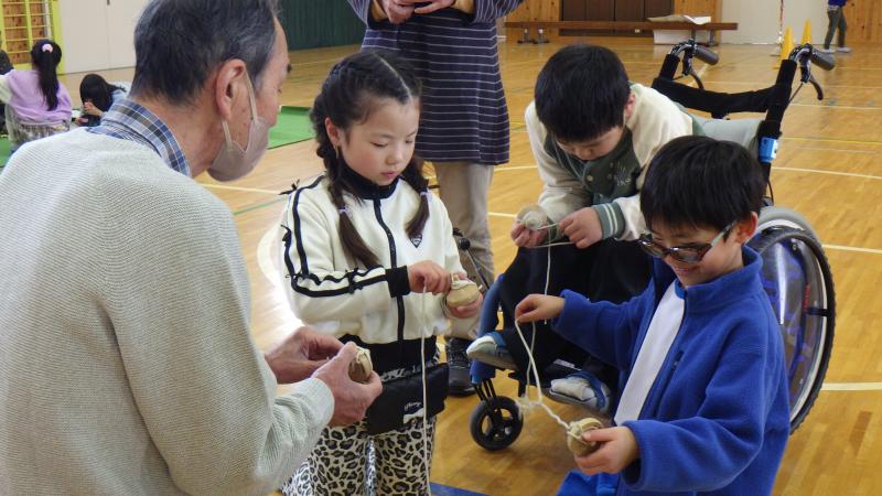 3月2日(月)に地域の人をお招きして「昔遊びを楽しむ会」を開きました。1年生が「けん玉」「おはじき」「こま」「あやとり」など7種類の遊びを教えてもらいました。何回も挑戦していくうちに、どんどん上手になる子もいました。短い時間でしたが、昔遊びを存分に楽しむことができました。