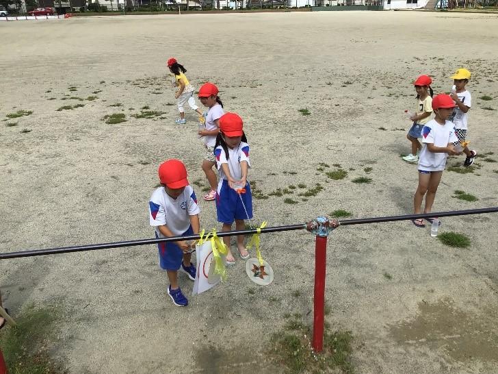 用意した水遊びの道具で的をめがけて遊んだり、友達と水を掛け合ったりと、水遊びを全力で楽しみました。