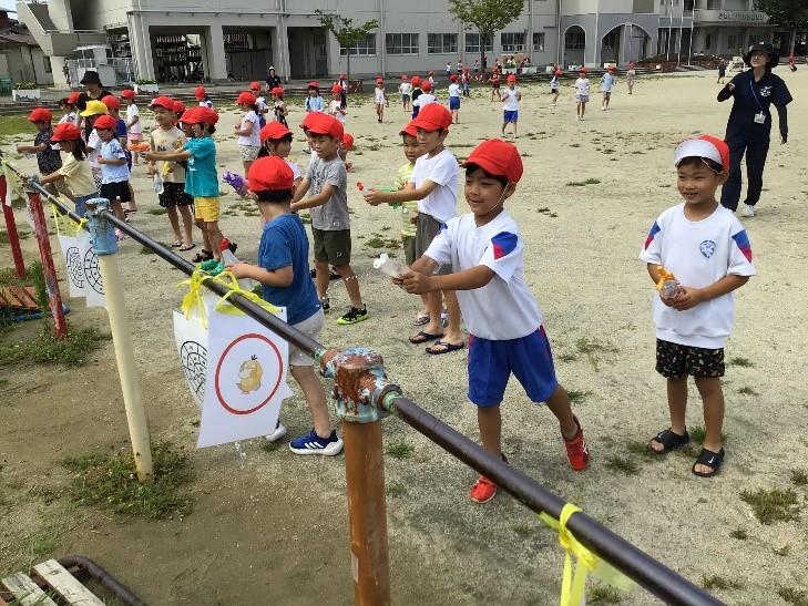 7月3日(水)に生活科「なつとなかよし」で水遊びをしました。子どもたちは、ペットボトルや空容器を使って、的に水を当てたり友達と水をかけあったりするのを楽しみました。天気にも恵まれ、とても気持ちのよい水遊びになりました。
