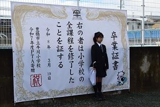 3月19日(木)に第79回卒業証書授与式を挙行いたしました。前日から降り続いた雨も朝のうちには止み、門出の日を祝うように春の温かさの中での式典となりました。卒業生は、堂々とした返事や別れの言葉に加え、聴く人を感動させるきれいで迫力のある合唱を披露し、皆清々しい表情で巣立っていきました。在校生代表で参加した5年生も立派な態度で臨み、一生懸命な呼びかけと合唱で送ることができました。また今年度は、PTA役員の方々の計らいで、フォトスポットをつくっていただき、記念撮影に花を添えてくださいました。牛川小職員一同、卒業生の今後に幸多かれと願っています。