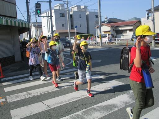 【登校の様子】 久しぶりの通学団登校です。班長さんを先頭に、手をあげて横断できていますね。