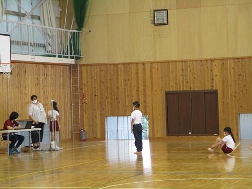 高学年は、分散登校中に、体育館で発育測定を行いました。間隔をしっかりあけて待っていますね。