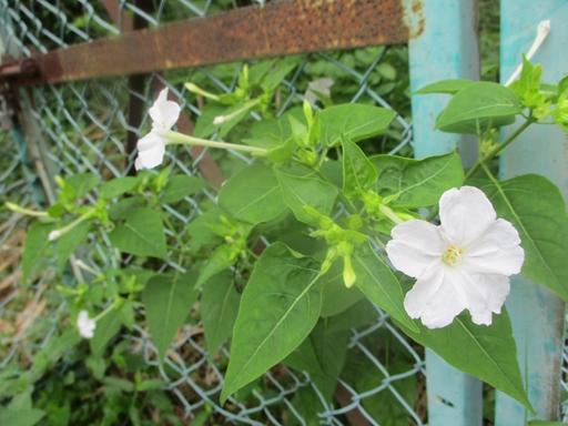 熟した黒いタネをつぶすと、中からおしろいのような白い粉が出てくるのでオシロイバナといいます。午後、4時ごろから咲く花です。ピンク、白、黄色があります。