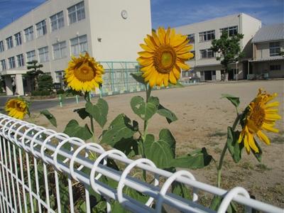 園芸委員と計画運営委員がコラボして育てた南門花壇のヒマワリが咲きました。毎日、暑い日が続き学校へ来るだけでも大変ですが、きれいに咲くヒマワリの花を見ると元気が出ますね。