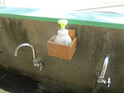 新型コロナウイルスが、なかなか収束しません。感染予防には、手洗いとマスクが大事です。外の手洗い場にもハンドソープボトルが置けるように、用務員さんが入れ物を作ってくださいました。
