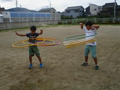 4つも5つもフラフープを重ねてくるくる回すフラフープ名人の4年1組A君とS君。すごいですね。フラフープも密にならずに遊べるので、おすすめの遊びです。みなさんも挑戦してみてくださいね。