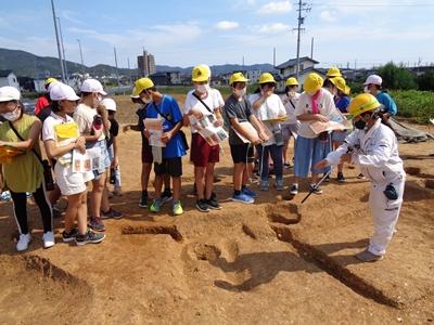庶民の集落の全容がわかるのは珍しいそうですが、9月になるとこの遺跡は道路工事のために埋められてしまいます。歴史の勉強を始め、奈良への修学旅行を控えた6年生が、最後のチャンス8月31日(月)にみんなで見学に行きました。