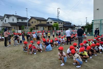 今回は、地震で放送機器が壊れて使用できない想定での避難訓練。密を避けるための3部制で行いました。1回目よ
