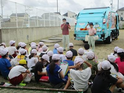 社会科で「ごみのゆくえ」を学習しています。出前授業でごみ収集車がきて、実際にごみを捨てさせてもらったり、詳しくお話を聞いたりしました。