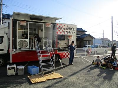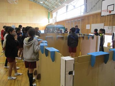 避難所の仕切りを段ボールで組み立てたり、震度7の揺れを起震車で体験したりしました。